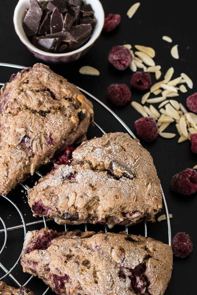 These scones are the perfect addition to your vegan brunch! Made with healthy whole grains and balanced perfectly with raspberries, almonds and just the right amount of chocolate.